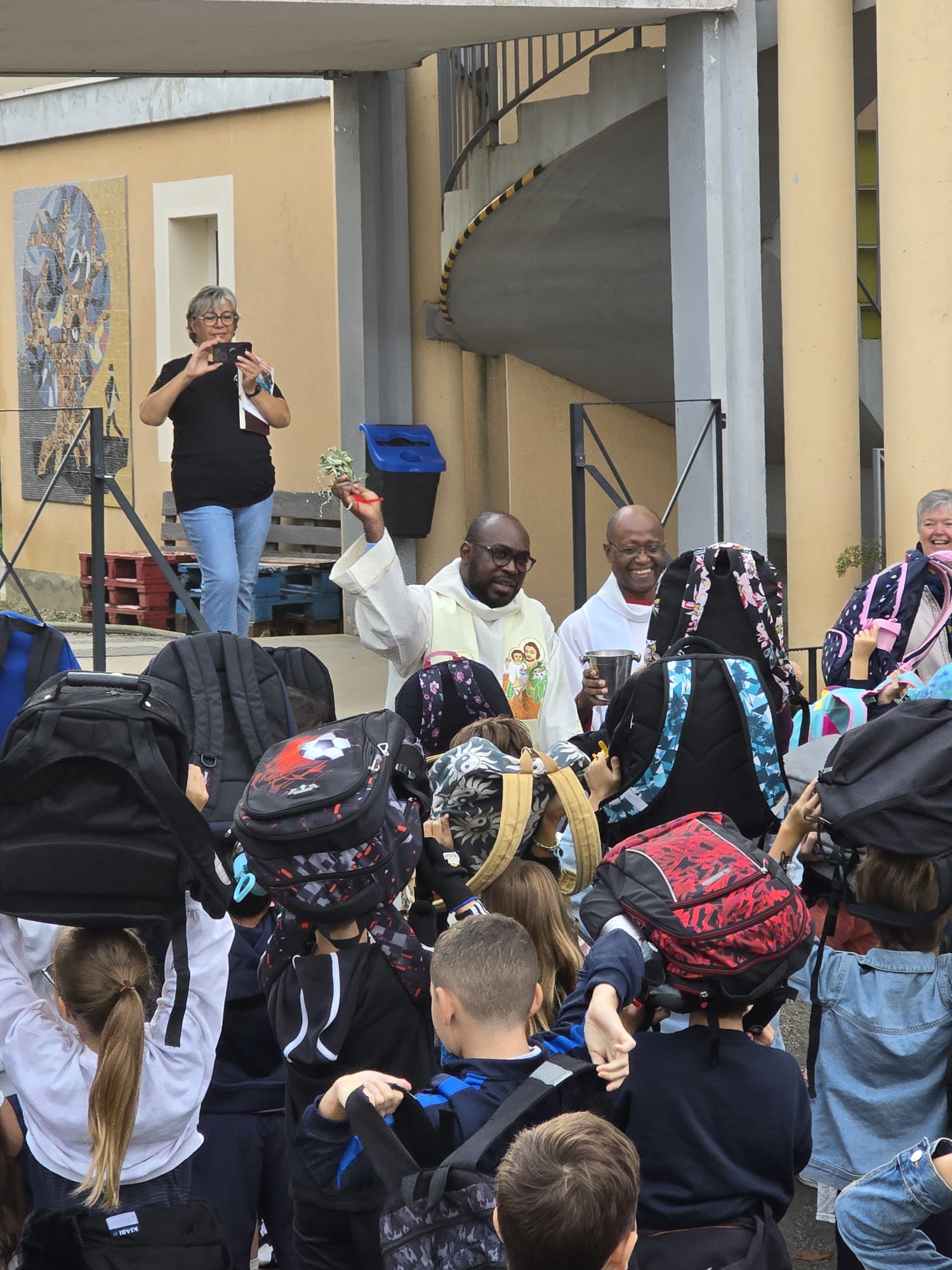Le prêtre, fidèle à ce rendez-vous annuel, a adressé aux enfants un message chaleureux accompagné d’une prière, les invitant à vivre une année riche en apprentissages, découvertes et amitiés. À l’issue de son discours, les élèves ont levé leurs cartables bien haut, prêts à recevoir la bénédiction.