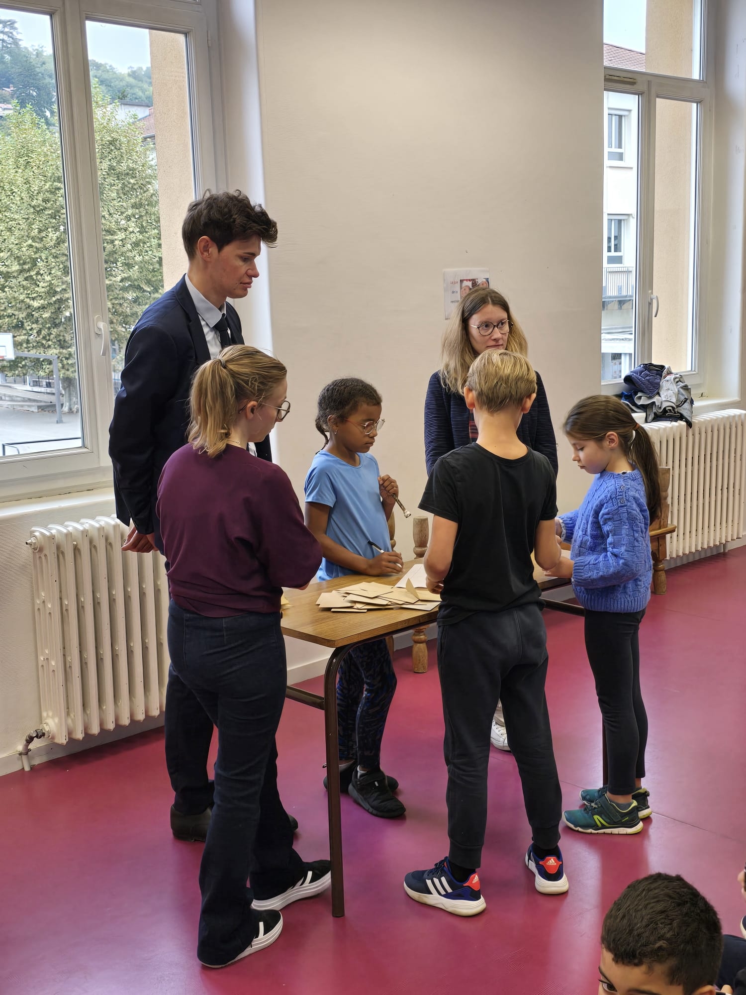 Etaient présents pour les élections, M. MAZARET, adjoint aux affaires scolaires, Mme ELGUE, encadrante CME, Mme ROLE, directrice école et les enseignantes.