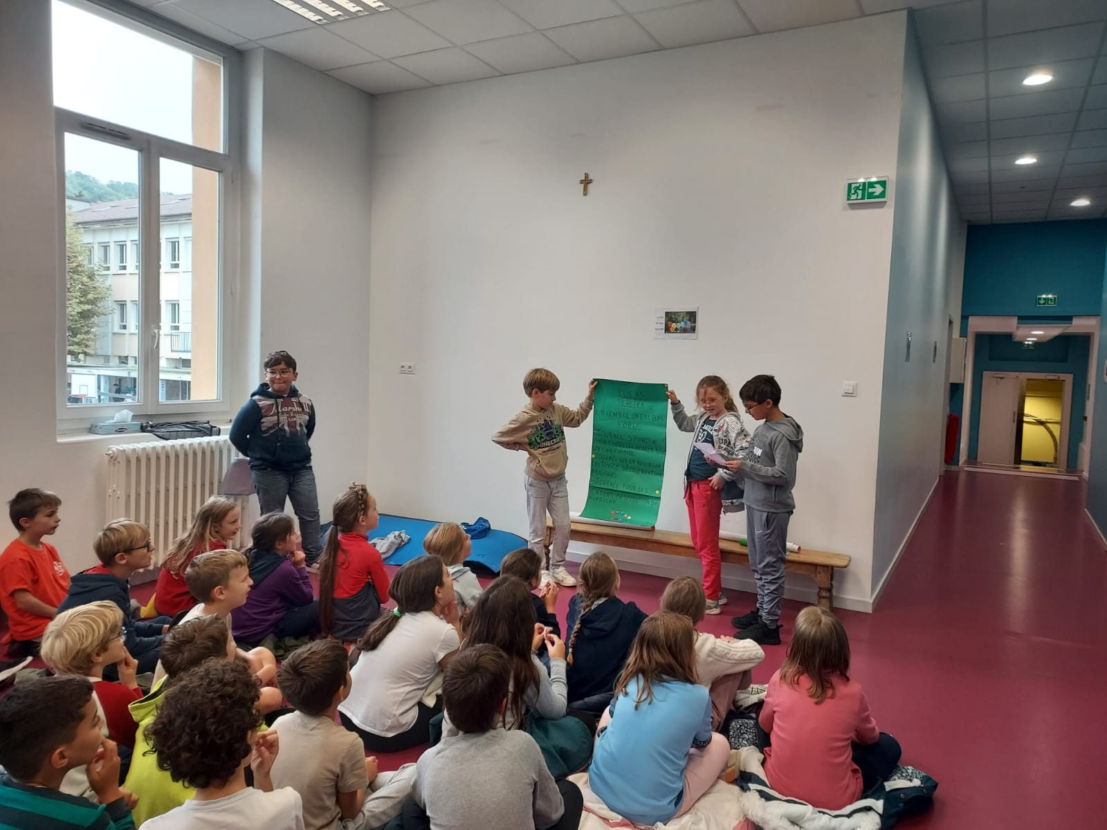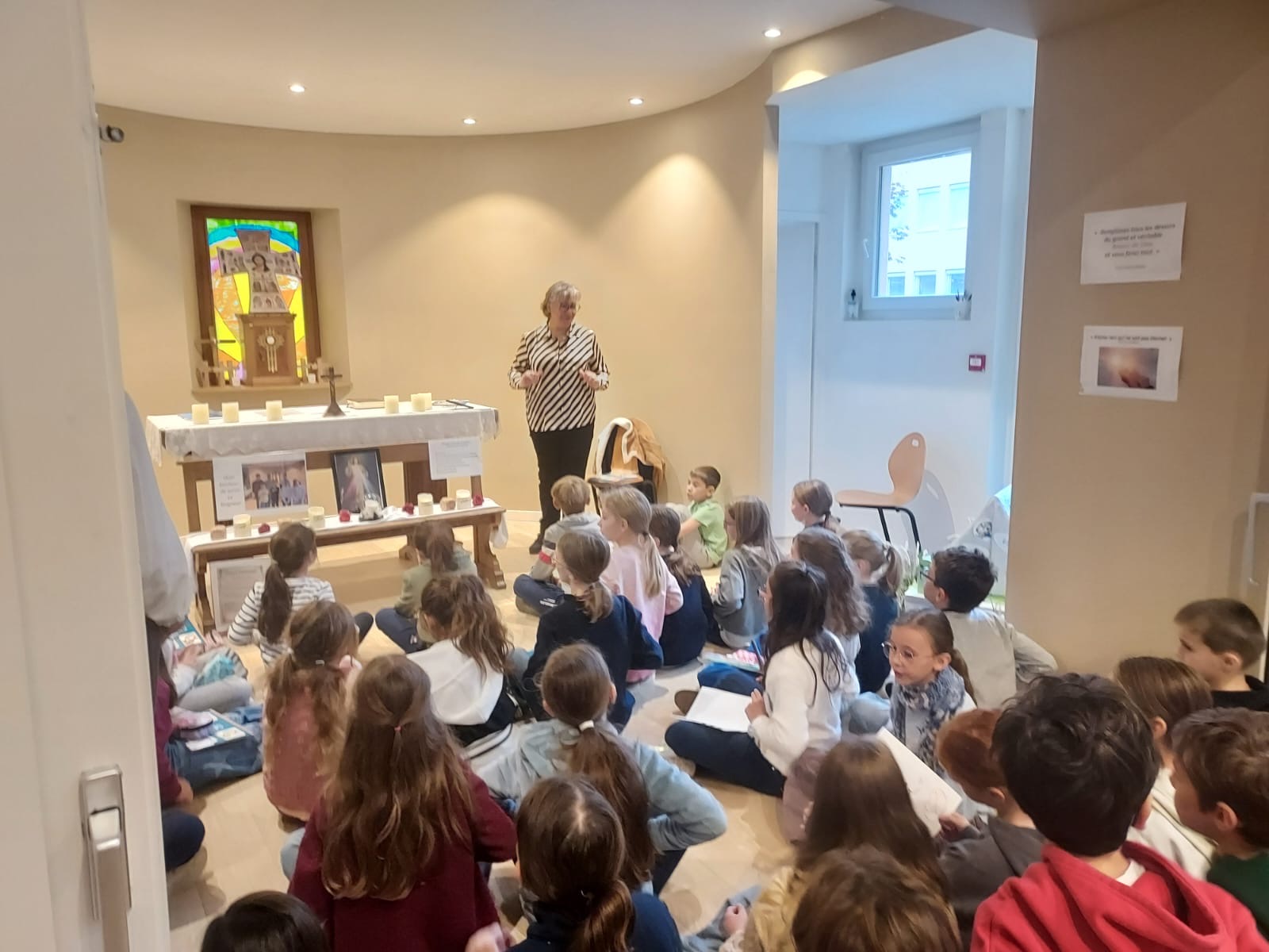 Tout au long de l’année, les élèves de primaire participent à des temps de pastorale avec leur classe. Ces moments se déroulent à l’oratoire, un lieu propice au calme et à la réflexion, où les enfants découvrent l’histoire sainte à travers des récits, des échanges et des activités adaptées à leur âge.