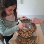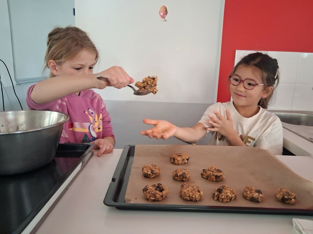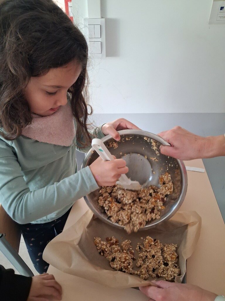 Afin de redynamiser ce projet, les classes de CP et de CE2 ont organisé un atelier cuisine pour préparer des goûters « zéro déchet ». Accompagnés de parents d’élèves, les enfants ont réalisé plusieurs recettes : cookies, sablés, barres de céréales, financiers aux amandes et pain d’épices.