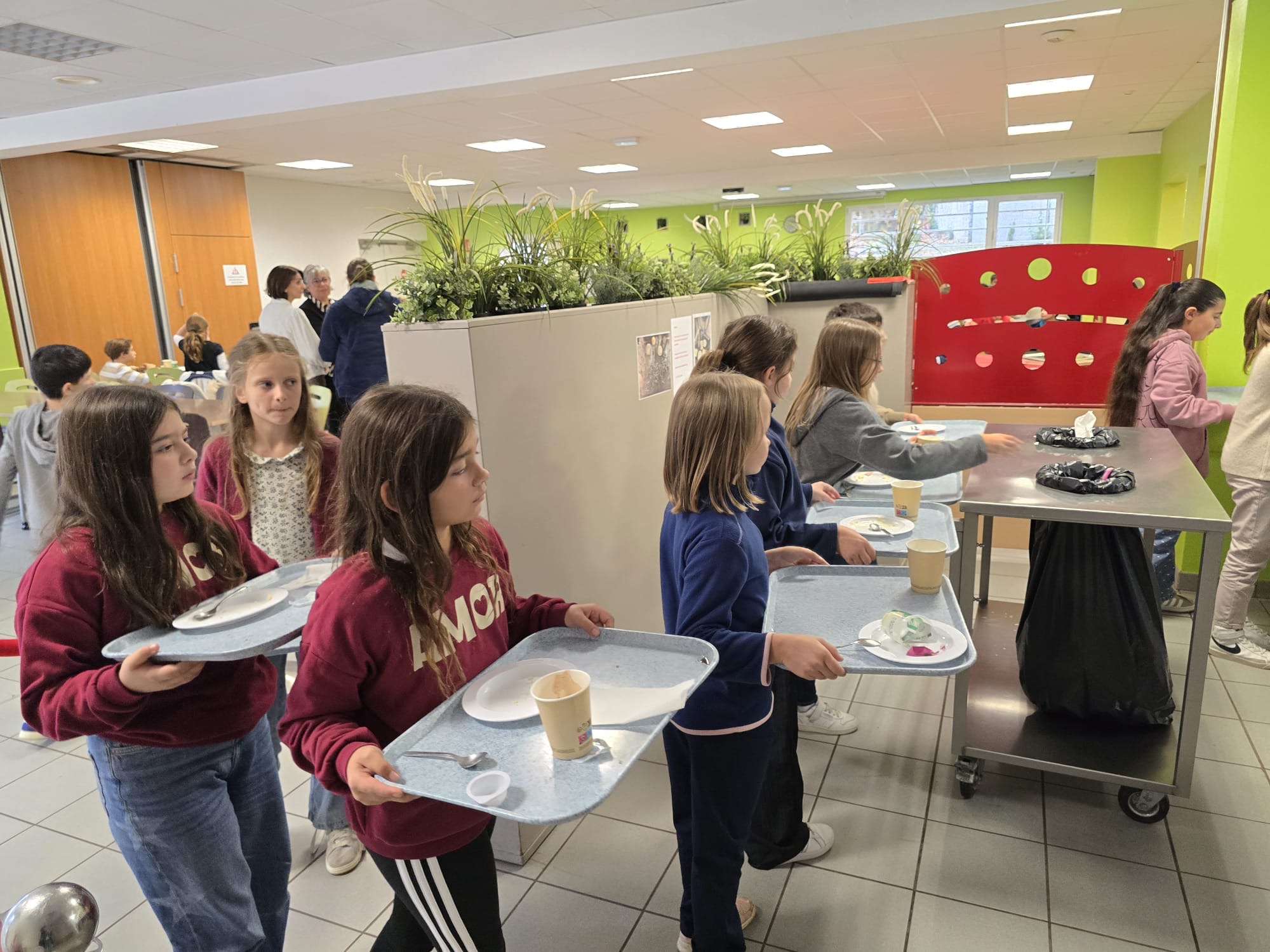 La cantine joue également un rôle éducatif en sensibilisant les enfants au respect de l’environnement. Après le repas, ils participent au tri des déchets : les emballages recyclables sont déposés dans la poubelle jaune, tandis que les restes alimentaires dans la poubelle noire.
